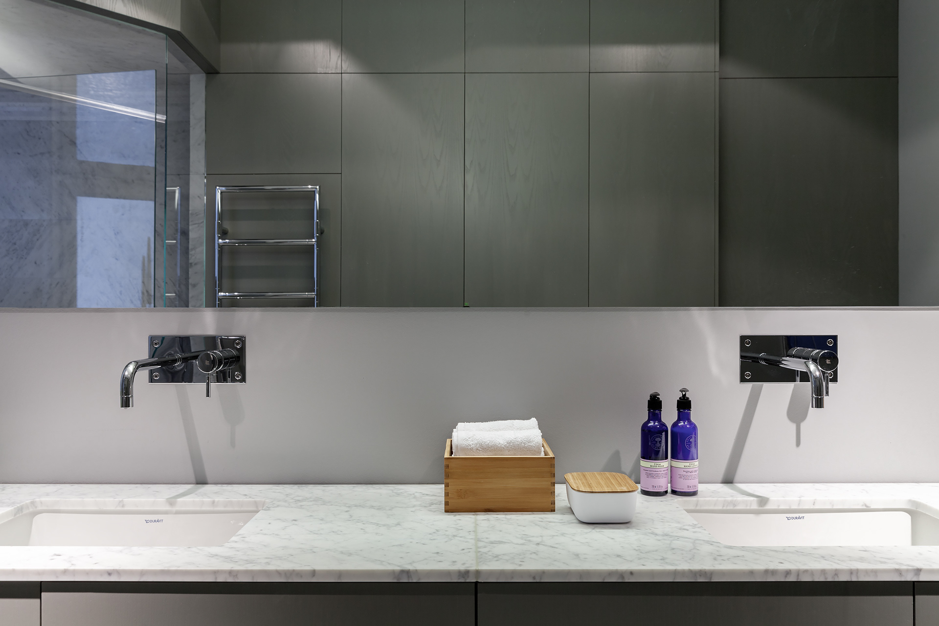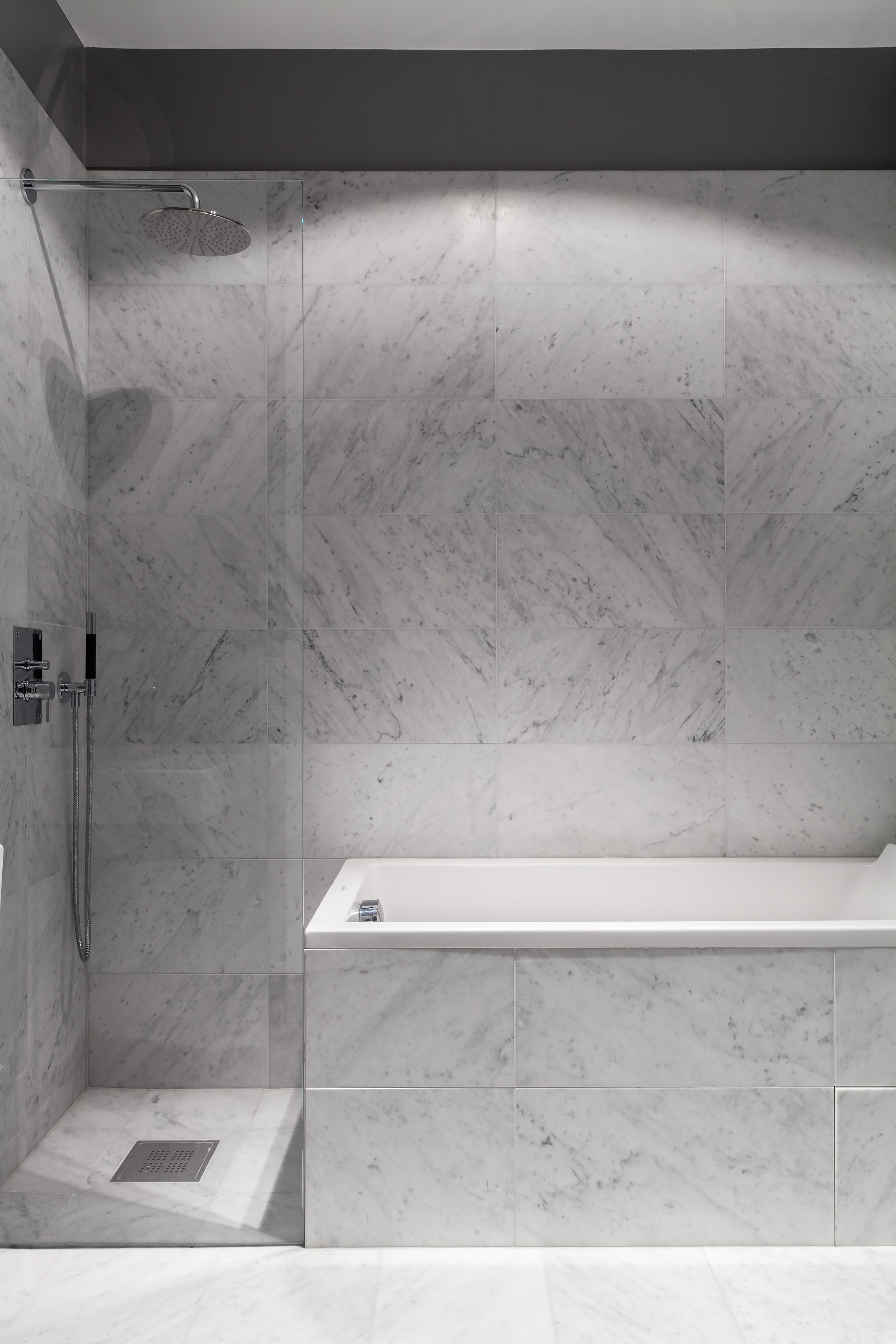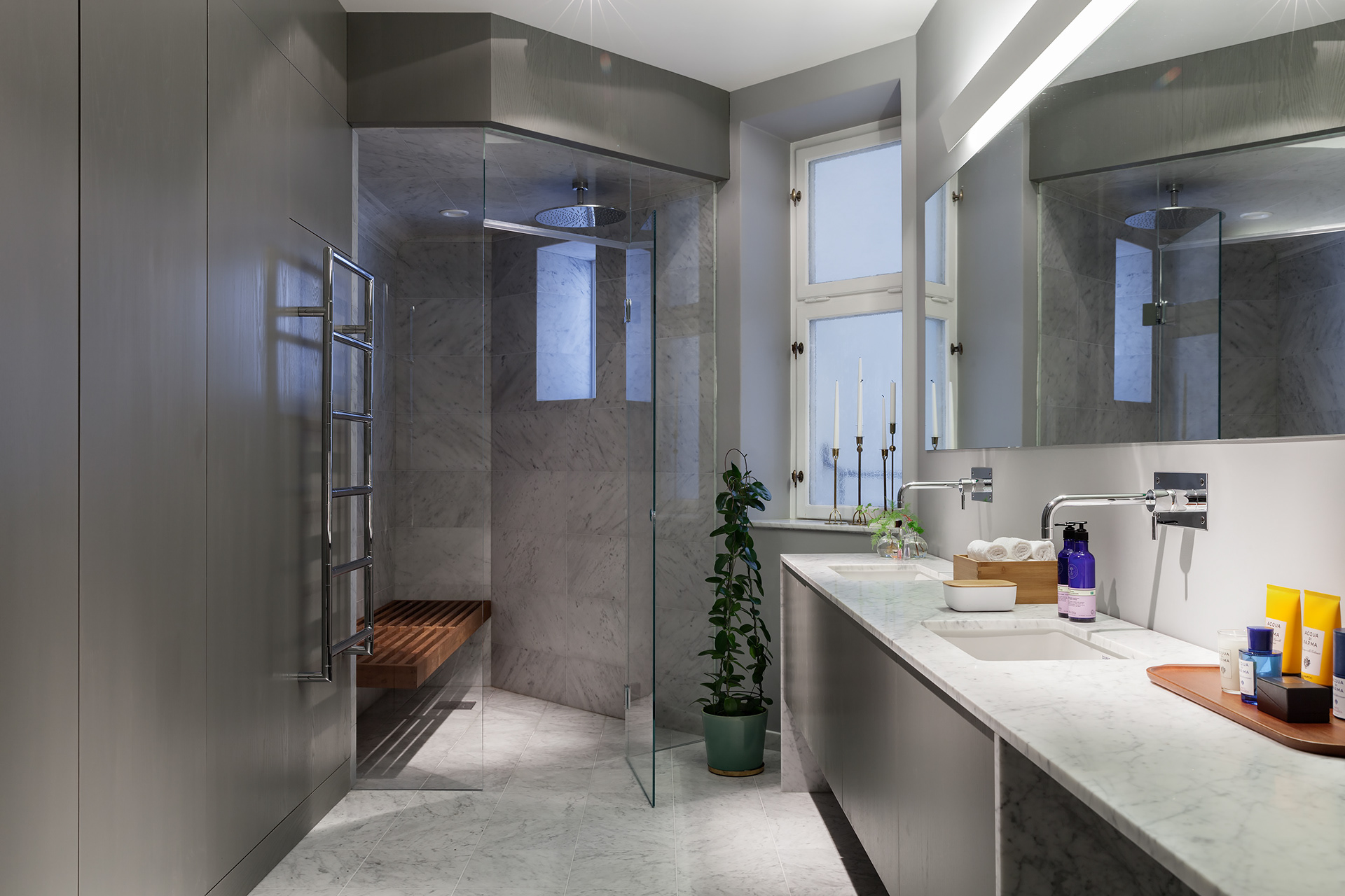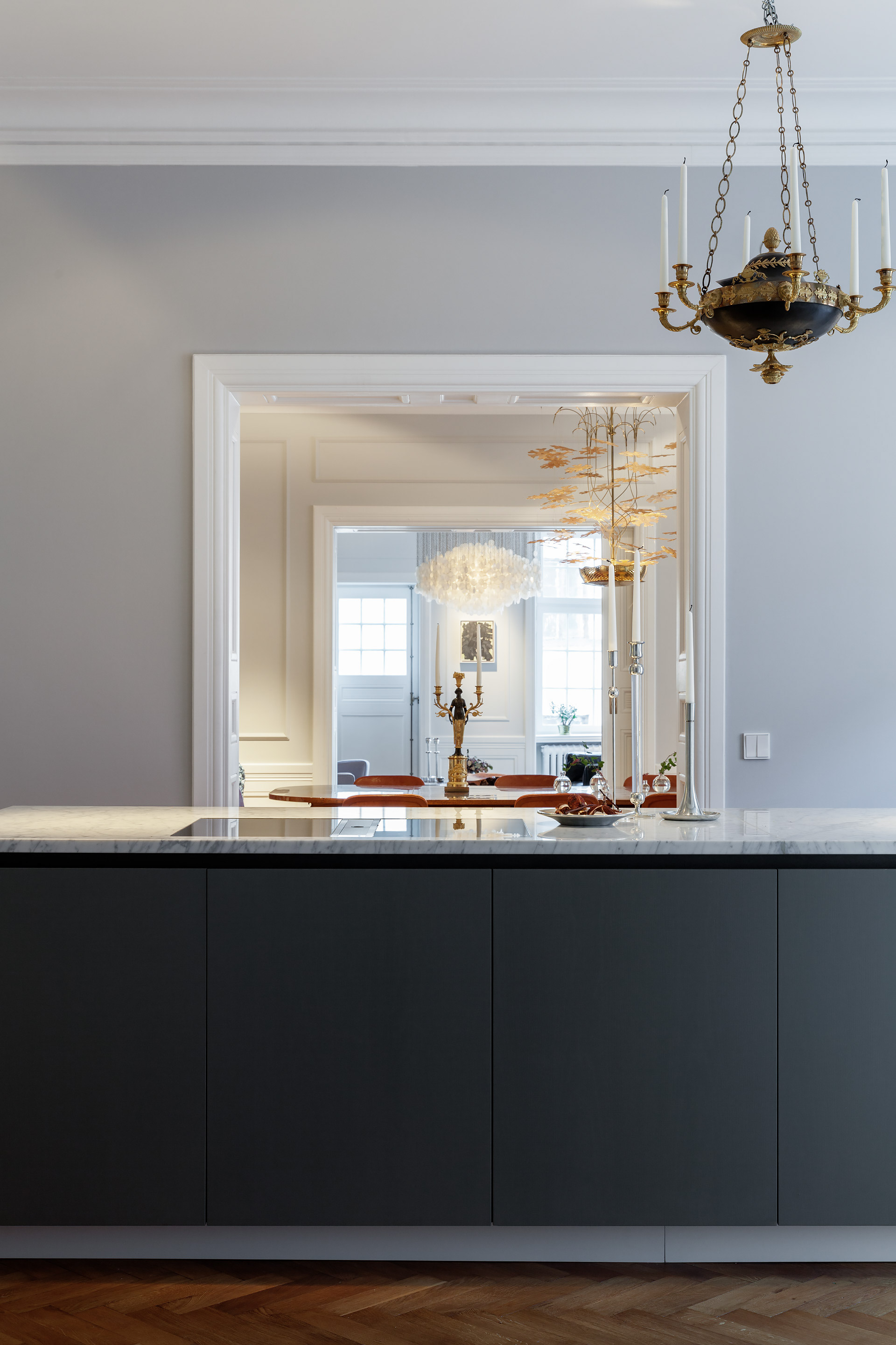 A Turn-of-the-Century Apartment Reimagined At its core, a classic turn-of-the-century apartment, transformed from a heavy-handed 1970s renovation into a bright, confident interior. Original details have been brought back to life and paired with a minimalist, contemporary design. Crisp white surfaces, warm wood, and luxurious Calacatta marble create a striking dialogue between past and present – a home with both history and edge.